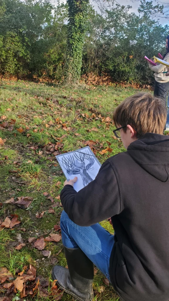 Les élèves de la classe de 1STAV1 ont pu rencontrer l’artiste conférencier Dominique Mansion autour d’un atelier découverte des arbres taillés en trogne. Le but était d’observer différemment et attentivement ces arbres qui peuvent avoir des formes atypiques.  Suite à l’observation, les élèves ont réalisé des dessins à l’aide de fusain et de craies grasses tout en bénéficiant des conseils de Monsieur Mansion. Un moment suspendu qui a conduit à de belles réalisations qui seront exposées lors de la journée du printemps des transitions le 24 Mars.