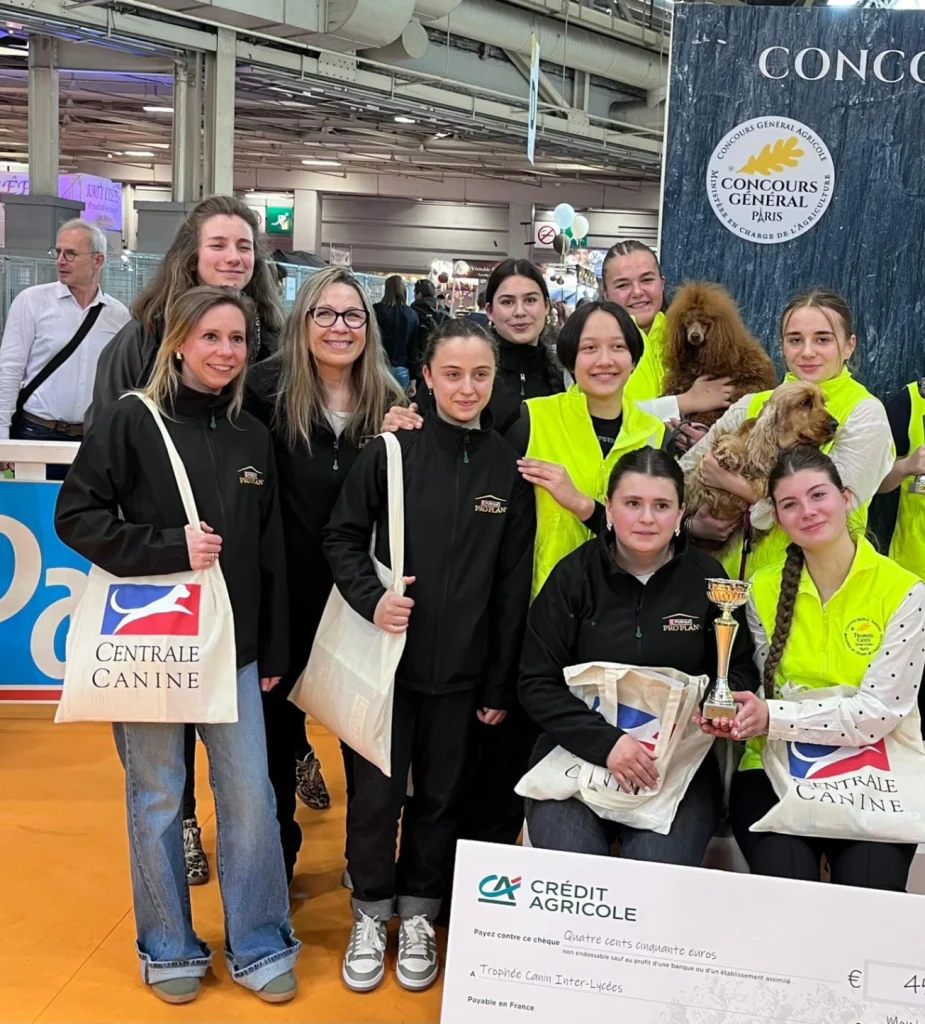 Une équipe dynamique composée d’élèves de première bac pro canin a participé au Trophée Canin Inter-Lycée (TCIL). Les quatre titulaires, Louna , Romane.D , Eva et Justine ont été accompagnées par Maé en tant que suppléante, ainsi que Mathilde et Romane.B qui ont apporté leur soutien tout au long de l’événement.